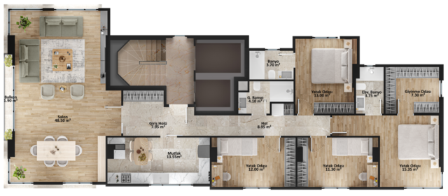 - Net 152 m² – Brüt 209 m² geniş aile planı
